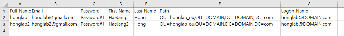 New-ADUser -DisplayName "honglab" -AccountPassword $(ConvertTo-SecureString -AsPlainText "Password#1" -Force) -Name "honglab" -EmailAddress "honglab97@gmail.com" -GivenName "HaeJang" -Surname "Hong" -UserPrincipalName "honglab@DOMAIN.com" -ChangePasswordAtLogon $True -Path "OU=honglab_ou,OU=DOMAIN,DC=DOMAIN,DC=com"