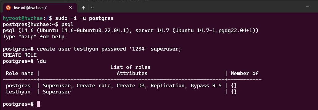Ubuntu 계정 생성 후에 Ubuntu에서 생성된 계정으로 접속 후 다시 PostgreSQL을 접속하면 정상적으로 접속 가능합니다.