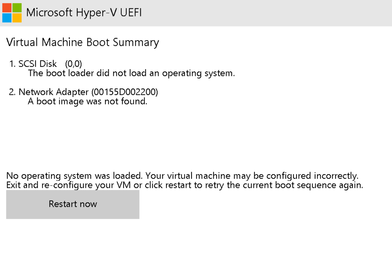 hyper-v no operating system was loaded your virtual machine may be configured incorrectly exit and re-configure you vm or click restart to retry the current boot sequence again