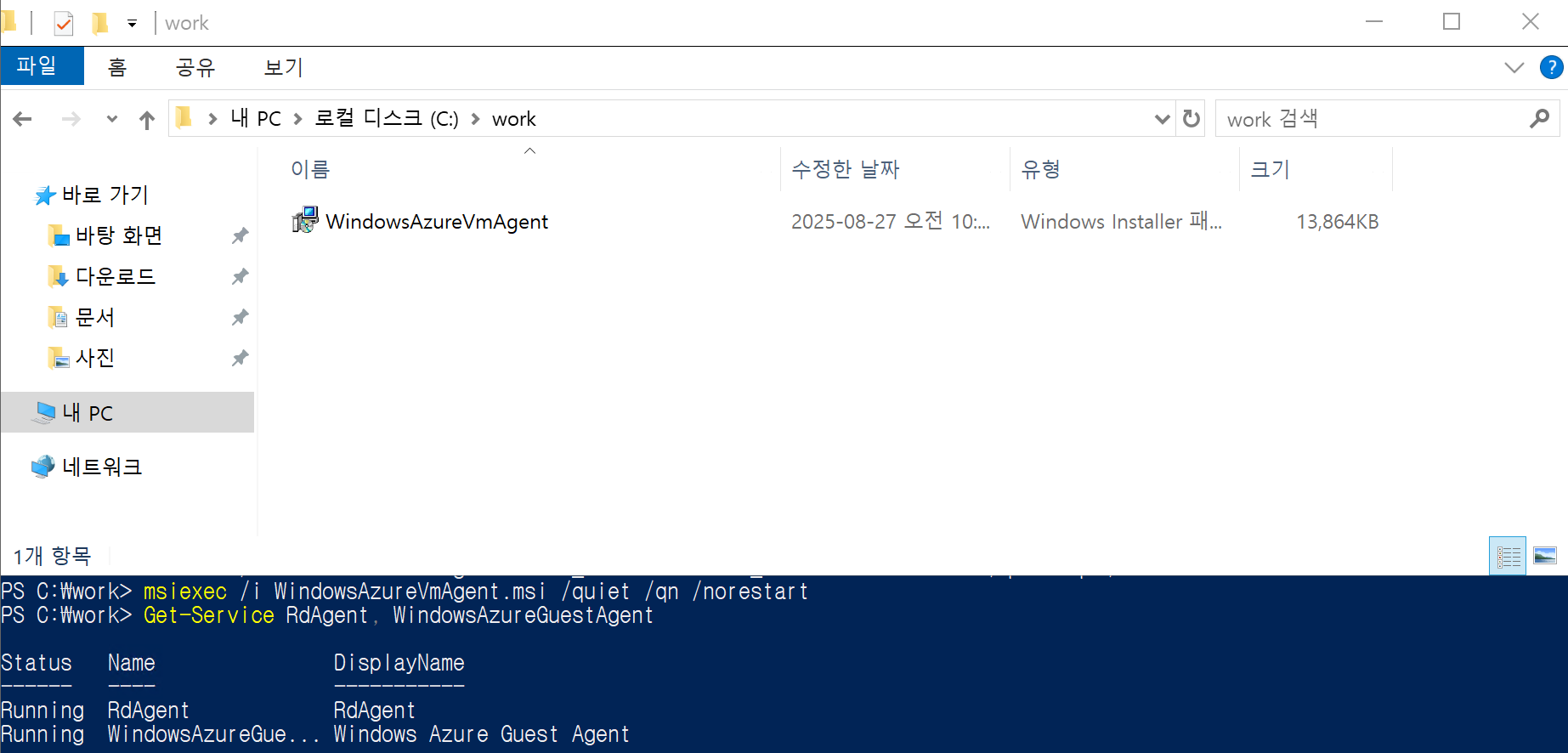 파일 다운로드 받고, C:\work 폴더에 위치해놓았다. 이름역시 기존의 이름이 아닌 WindowsAzureVmAgent.msi 으로 바꿔줬다.