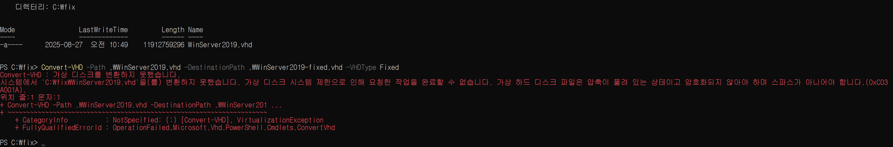 Convert-VHD -Path .\Win2019.vhd -DestinationPath .\Win2019-fixed.vhd -VHDType Fixed 이렇게 진행했을때 다음과 같은 오류가 발생했어~, Convert-VHD : 가상 디스크를 변환하지 못했습니다. 시스템에서 'C:\Job\Win2019.vhd'을(를) 변환하지 못했습니다. 가상 디스크 시스템 제한으로 인해 요청한 작업을 완료할 수 없습니다. 가상 하드 디스크 파일은 압축이 풀려 있는 상태이고 암호화되지 않아야 하며 스파스가 아니어야 합니다.(0xC03A001A)