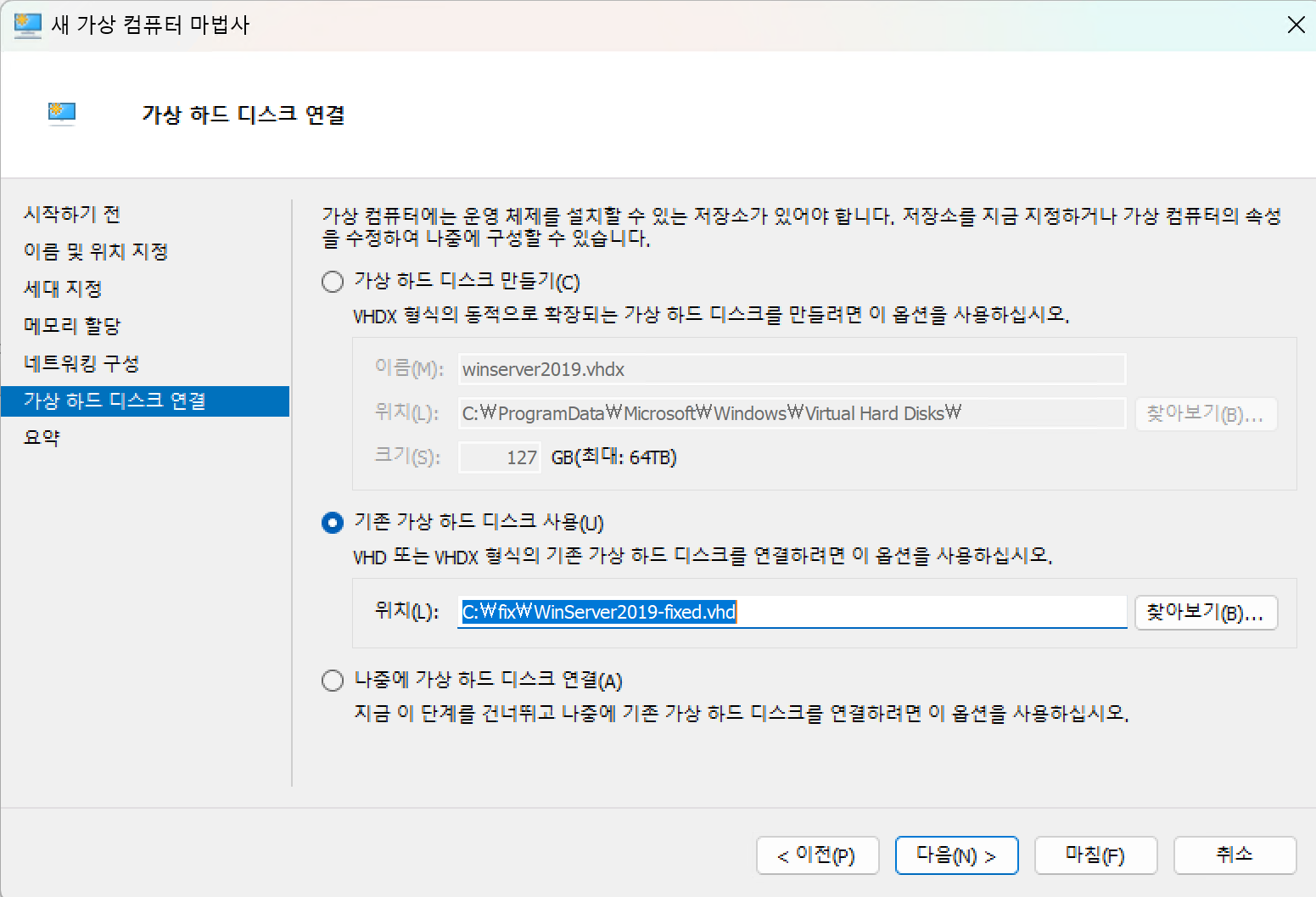 기존 가상 하드 디스크 사용을 선택해서 VHD 를 확인해준다.