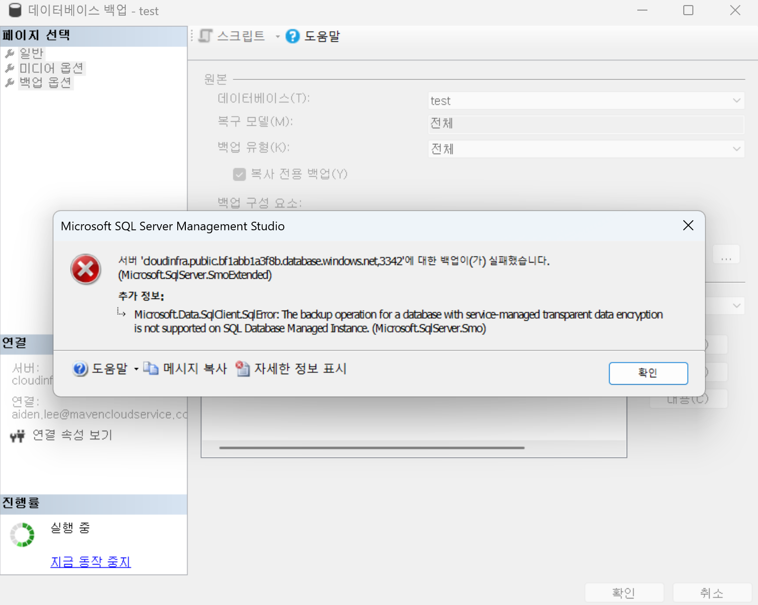 "Service-managed TDE(기본 TDE)가 켜져 있는 SQL MI는 사용자 백업(.bak)을 지원하지 않습니다."